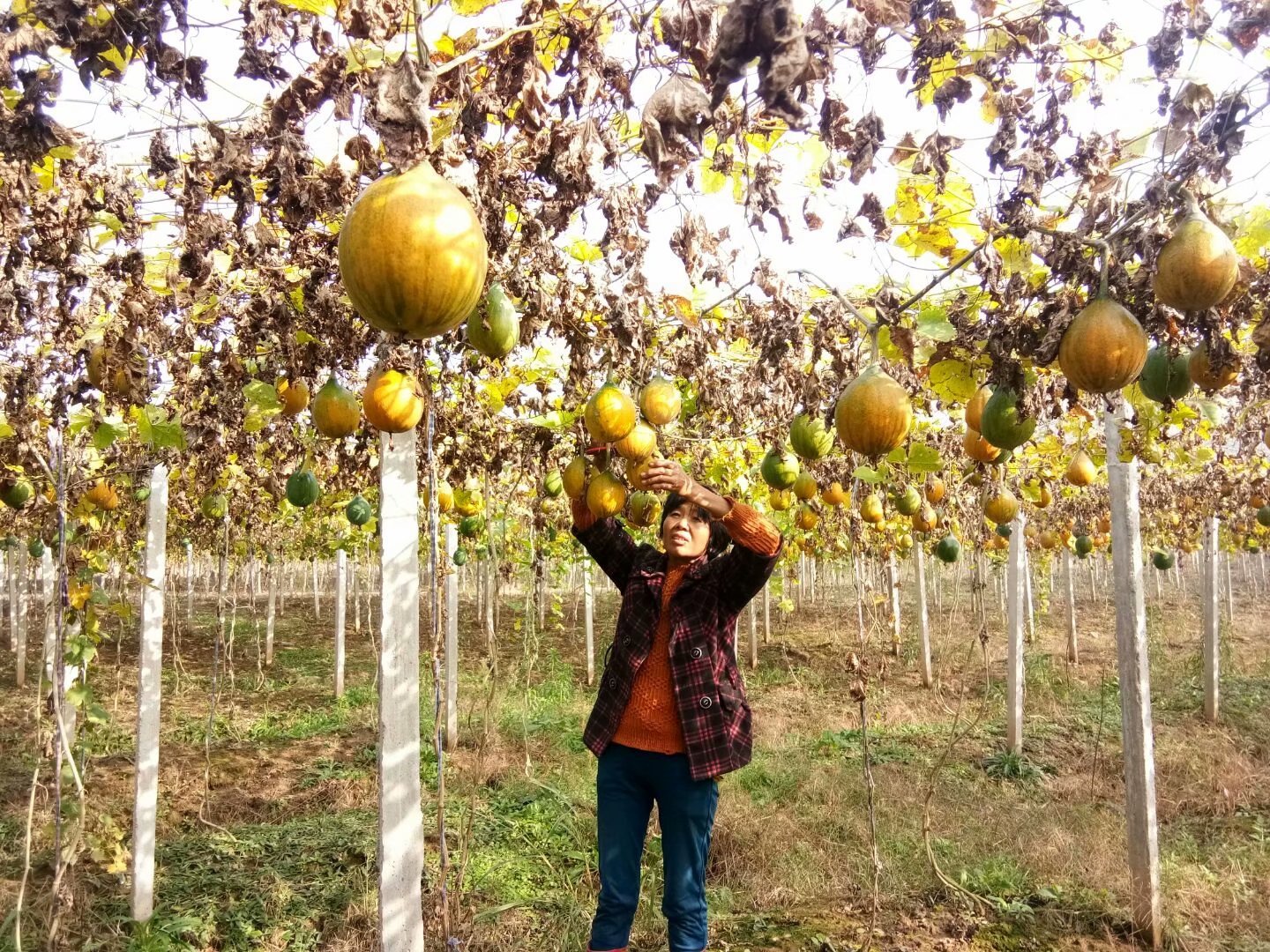 連綿的瓜蔞架和瓜蔞藤猶如綠色軍用帳篷,帳篷下掛著一個個一兩公斤大的金黃色瓜蔞,10多名工人正采摘著黃燦燦的果實,有的在分理瓜皮和瓜子,有的在沖洗瓜子,大家忙碌的身影呈現出一派豐收的喜慶景象。據該村瓜蔞基地負責人介紹,陶冬蘭、汪臘友、吳小華、丁小毛等4名貧困戶季節性用工都在這片瓜蔞基地里。